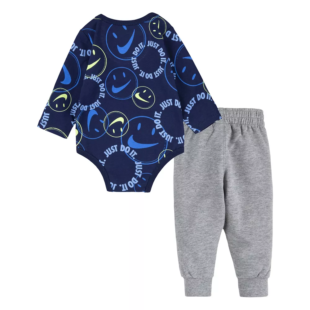 Keep your little man’s look fresh with this baby boys’ allover print bodysuit and joggers set from Nike.