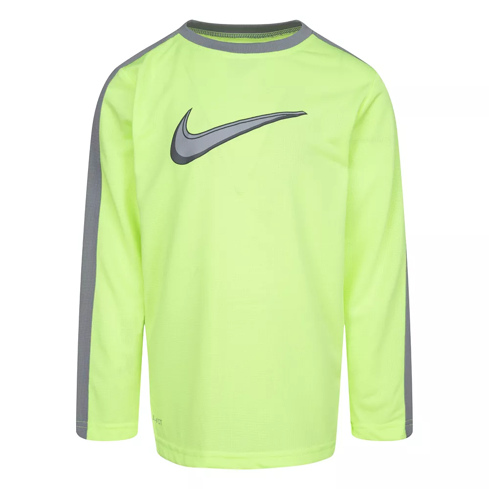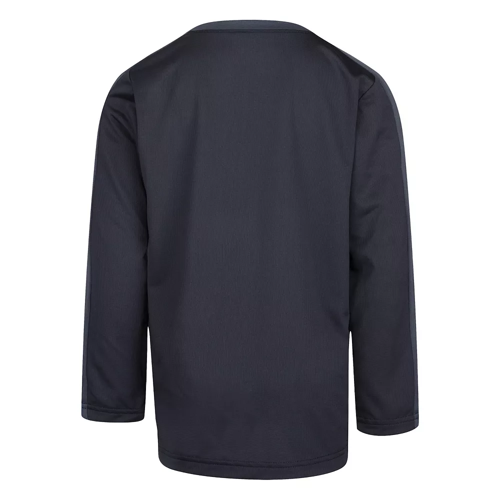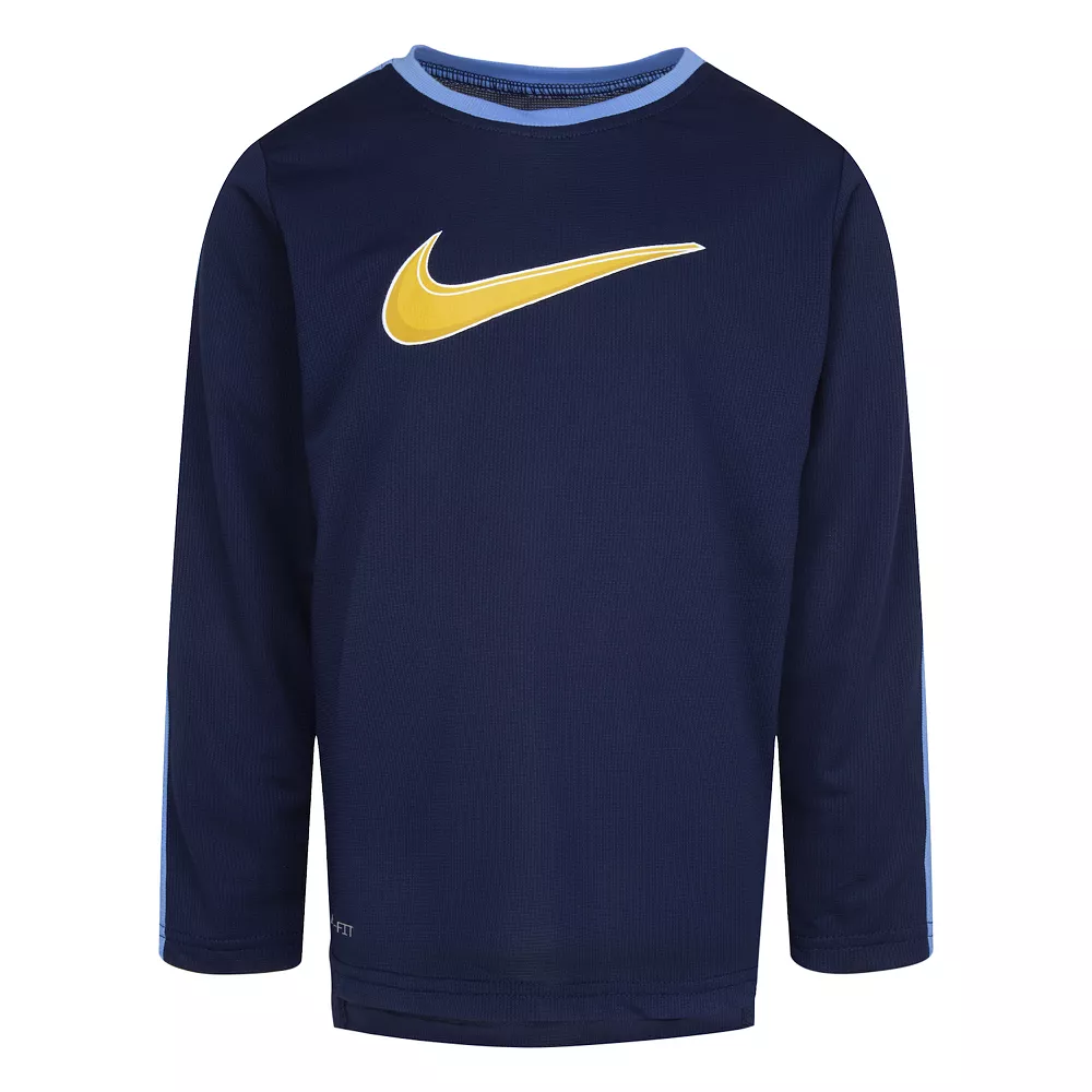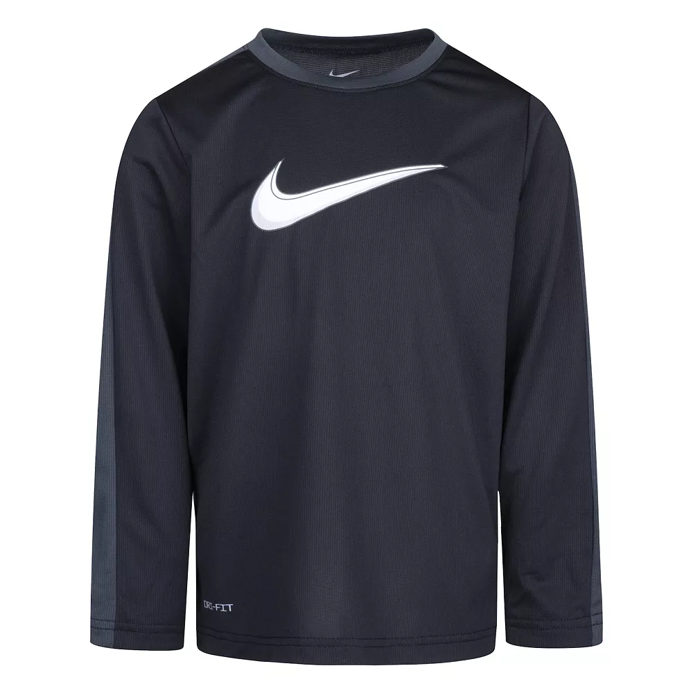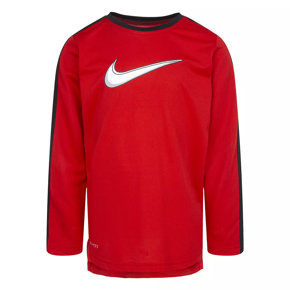 He’ll be ready for anything with this bold and athletic boys’ Nike All Day Play long sleeve knit top.