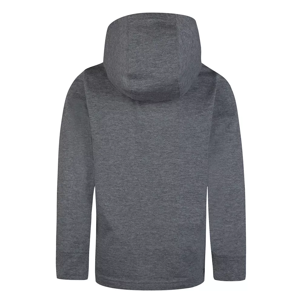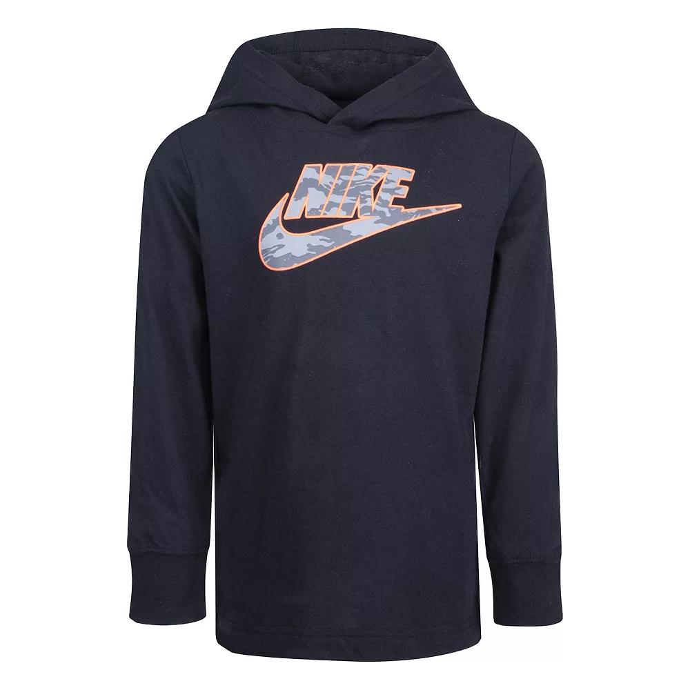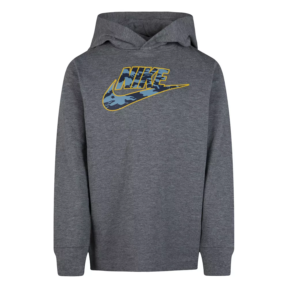 He’ll love his look in this soft and comfy jersey knit boys’ hooded graphic tee from Nike.